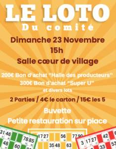 Le comité vous organise un loto d’exception avec des lots de qualités, une buvette inimitable, ainsi que des crêpes et des gaufres sensationnelles.